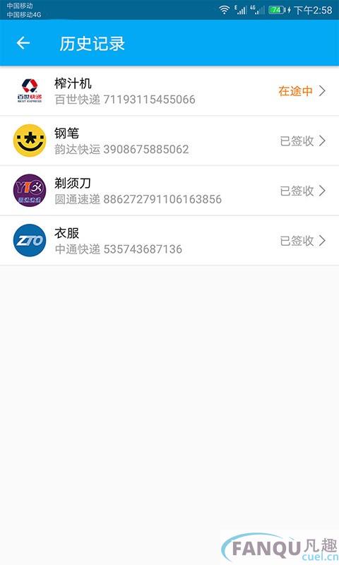 2、历史查询功能,实时查询,准确快速,方便实用,快递信息跃然指尖。