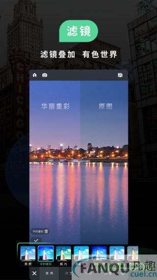 3、 内置多款镜头让你的手机摄像头更强大! 双重曝光镜头、鱼眼拍照、四格镜头、拼图镜头、移轴镜头,让你体验拍照的乐趣! iPhone版还支持单反相机专业的对焦和测光分离功能!内置“GIF短视频”镜头!让摄影达人、视频创意达人除了用图片表达外,还可以实现“创意超动态短视频摄影”!
