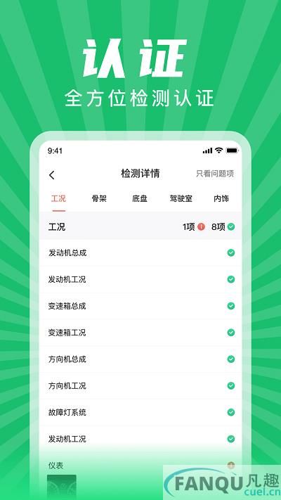 2、以二手商用车标准的检测体系,107项检测标准,为您提供二手商用车技术检测鉴定报告,让您买的放心,不看实车也可出价。