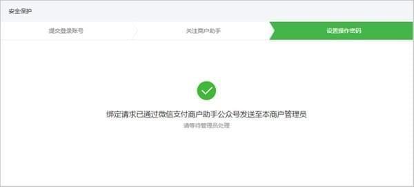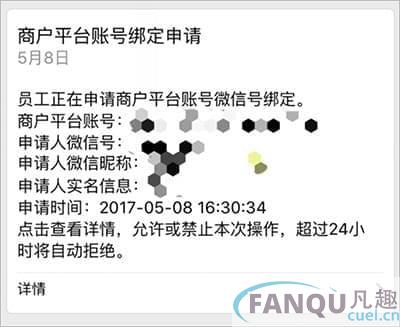 d、本商户主账号(超级管理员)审核绑定。主账号超级管理员将在微信公众号微信支付商户助手中收到提醒消息,点击消息即可进行处理,可允许或拒绝本次绑定请求。(请注意:绑定消息在24小时内处理有效,超过24小时候本次绑定请求将按照拒绝处理。)