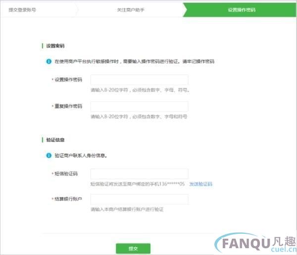 c、设置操作密码,验证短信验证码及结算银行账户,提交后即可完成绑定。