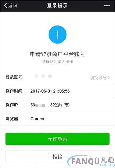 2、扫描后,在手机端进行登录确认处理。可在登录账号右侧点击切换帐号,切换至本微信绑定的其他商户平台帐号。点击允许登录,稍等片刻商户平台网站即可完成登录。