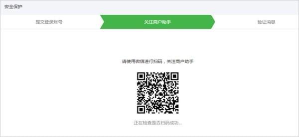 b、扫描二维码关注商户助手;(请注意:1、关注微信支付商户助手后,请勿取消关注;2、登录账号的实名信息,与微信号当前绑定银行卡的实名信息必须一致)