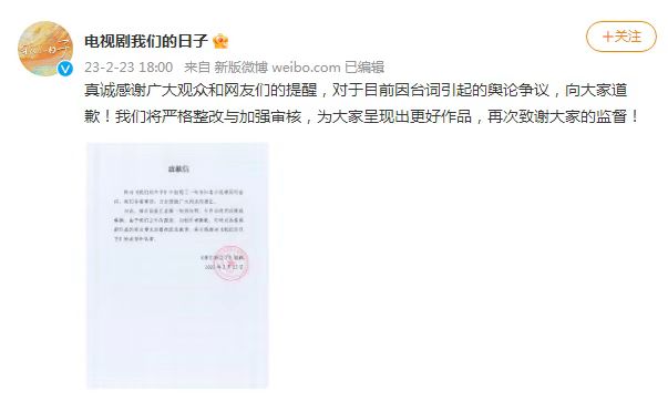 此消息一出也引发了众多网友的热议,纷纷在其官微下留言,迫于舆论的压力,今天晚些时候电视剧《我们的日子》发布了道歉声明,称“真诚感谢广大观众和网友们的提醒,对于目前因台词引起的舆论争议,向大家道歉!我们将严格整改与加强审核,为大家呈现出更好作品,再次致谢大家的监督! ”