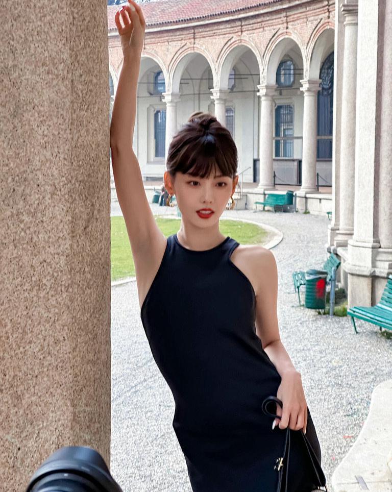 张嘉倪一反机场疲惫的状态,米兰时装周的她生图非常突出。张嘉倪留着刘海,将头发扎了起来,露出了优越的肩颈线条,十分迷人。张嘉倪戴着金属耳环,涂着红唇,气场全开,格外好看。她穿着黑色吊带紧身裙,对着镜头摆弄着姿势,看得出来身材非常优越。
