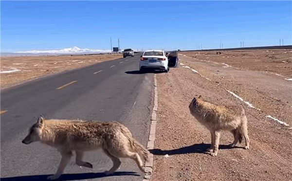 外出自驾旅游时,如果在野外碰到不熟悉的野生动物,不可贸然下车接近,以免遭受到野兽的意外伤害。2月26日,青海,一男子自驾游偶遇两匹狼,前车女子将狼误认为是狗,下车准备拍照,而且这两匹狼已经注意到这位女子。
