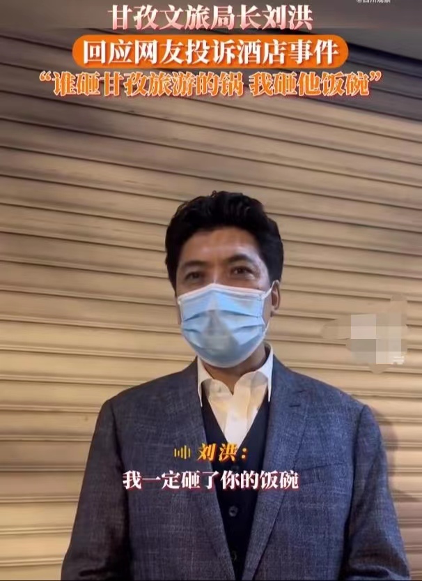 当晚,甘孜文广旅局局长刘洪针对网友投诉酒店事件霸气发声:“如果是谁砸了甘孜旅游的锅,我一定砸了他的饭碗,不管你是谁。”
