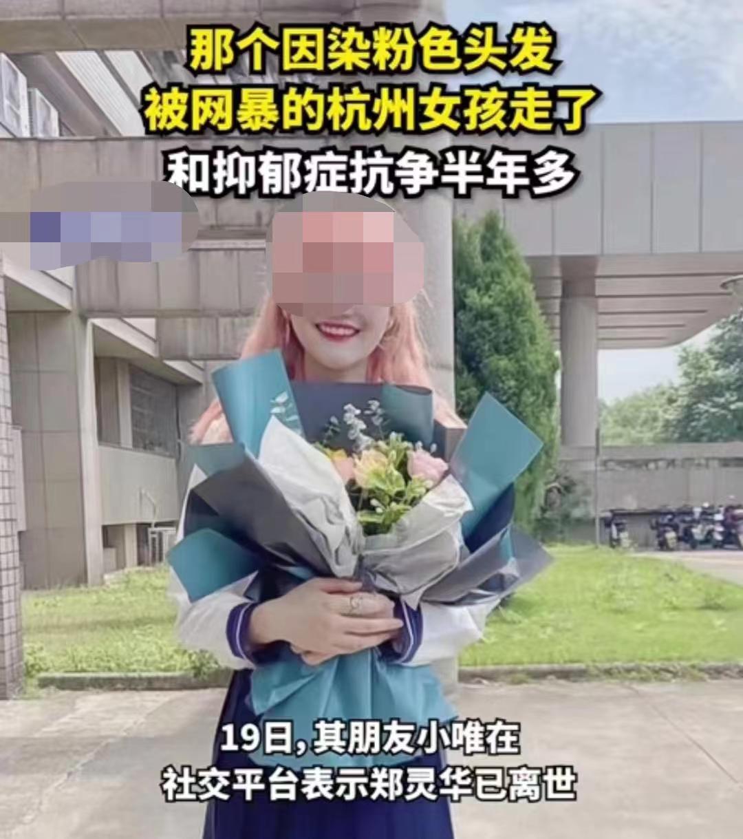 “粉色头发女孩”网名叫做“鸡蛋姬”,真名郑灵华。她因染了粉色的头发,拿着华东师范大学的研究生录取通知书去看望在病床上的爷爷被网暴、造谣。直到2月19日,网友“熊猫控小唯”发布了她因抑郁症去世的消息。