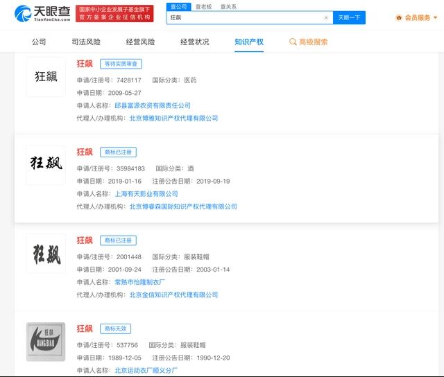 电视剧爆火的背后,资本也开始盯上了这部电视剧和电视剧所产生的热度。据天眼查App显示,“狂飙”已被多方注册为商标,申请人包括影业公司、传媒公司、机械公司以及自然人王某、崔某某等,国际分类包括服装鞋帽、教育娱乐、健身器材等,这些商标最早申请于1989年,其中20多枚商标状态为已注册,另有20多枚已为无效状态。值得一提的是,北京奔驰汽车有限公司已注册多枚运输工具类“狂飙”商标。