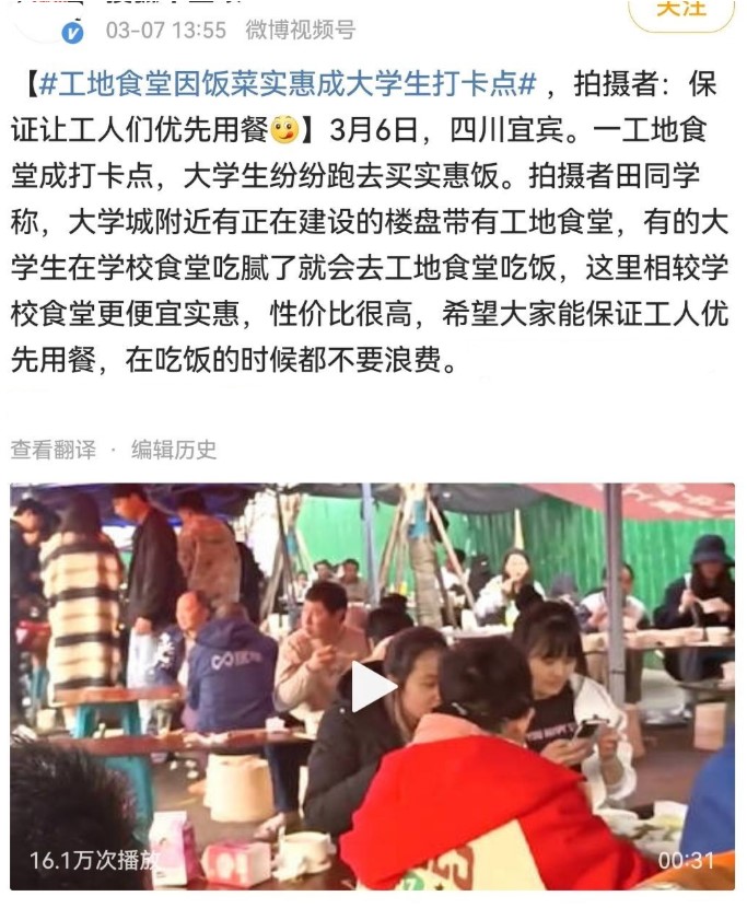 本站获悉,3月6日,四川宜宾。一工地食堂成打卡点,大学生纷纷跑去买实惠饭,该话题一时之间登上热搜。
