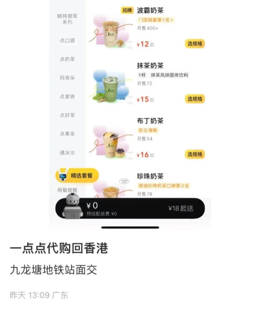 2月26日,社交平台上一条“一点点代购回香港,九龙塘地铁站面交”的帖子火了,短短时间收获评论超2000条,评论区则成为香港和内地网友的聊天区。一条问“香港没有奶茶吗”的留言得到不少香港网友回复:“一点点对于香港物价来说很便宜,香港一杯奶茶二三十元,一点点加了代购费(4元/杯)还没有香港本地贵”“香港买一杯,这里加代购费可以买两杯。”