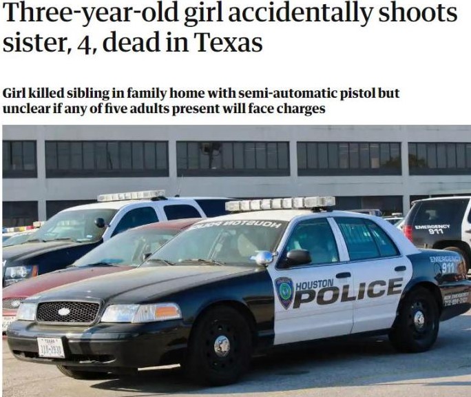 一名4岁的小女孩在家中遭枪击身亡,而开枪的,竟然是她年仅3岁的妹妹!!