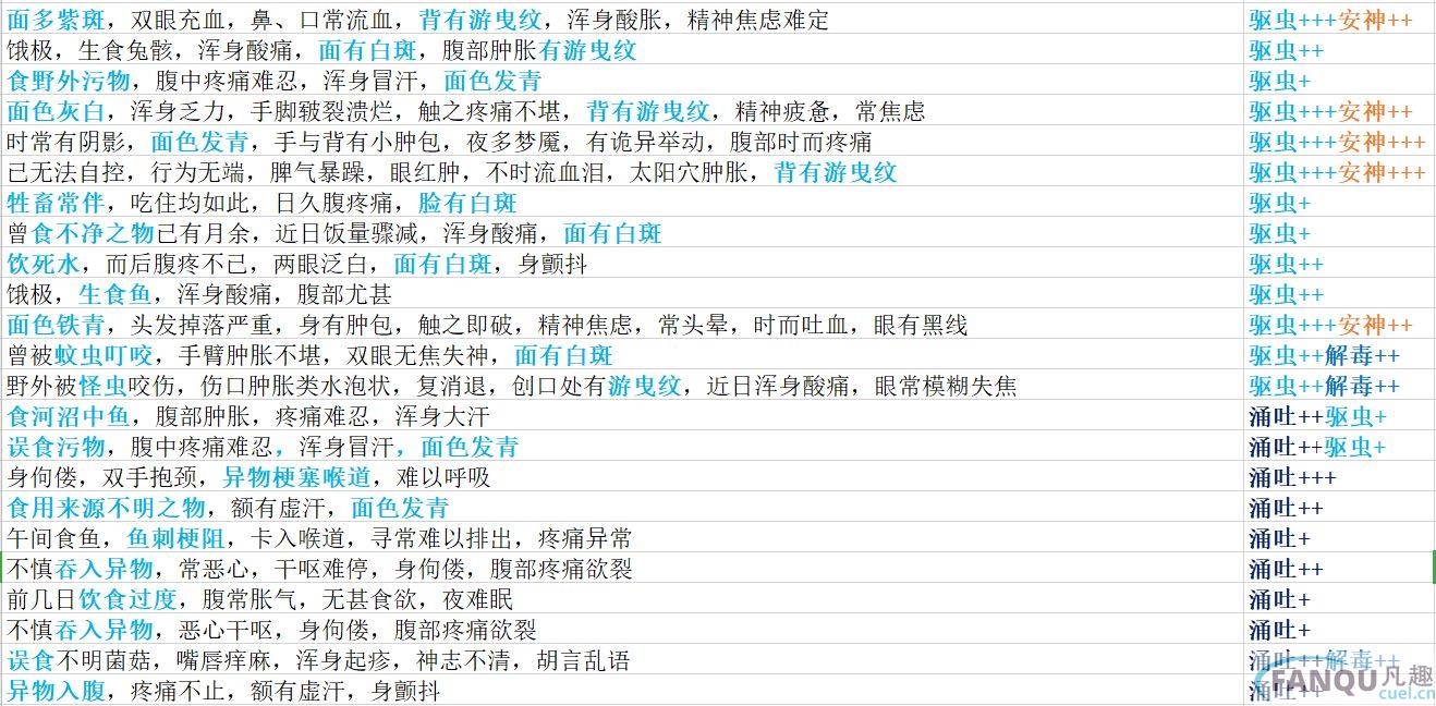 关键词“游曳纹”“面有白斑”“面色发青”还有各种吃生食、不净之物,食不明异物,饮死水,饮食过度等