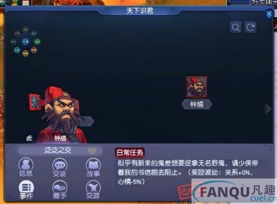 少侠在游戏世界中与NPC对话就可结识对应NPC,目前共有14位NPC可以供玩家结识(玩家的门派师父与钟馗为默认结识的NPC)。尚未结识的NPC在界面中将以“?”显示,未结识的NPC无法进行互动和领取事件任务等操作。玩家在界面中点击以“?”显示的NPC时将会有该NPC的提示,指引少侠前往结识哦~