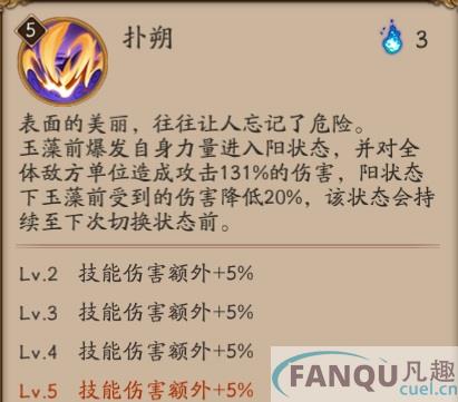 【扑朔】:3火,玉藻前爆发自身力量进入阳状态,并对敌方单体全体造成攻击131%的伤害,阳状态下玉藻前受到的伤害降低20%,该状态会持续至下次切换状态前。