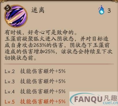 【迷离】:3火玉藻前凝聚狐火进入阴状态,并对目标造成自身攻击263%的伤害,阴状态下玉藻前造成的伤害增加25%,该状态会持续至下次切换状态前