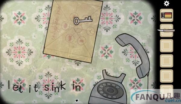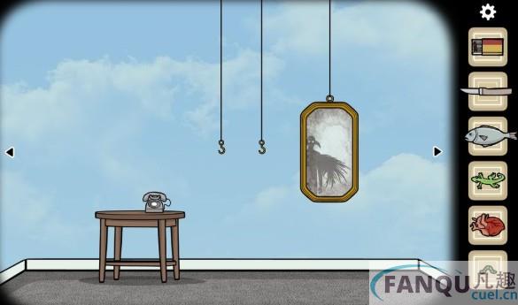 向右转,拿起电话,依次点击字幕r-i-s-e-u-p,画面中出现一个热气球。点击热气球让它飞走。