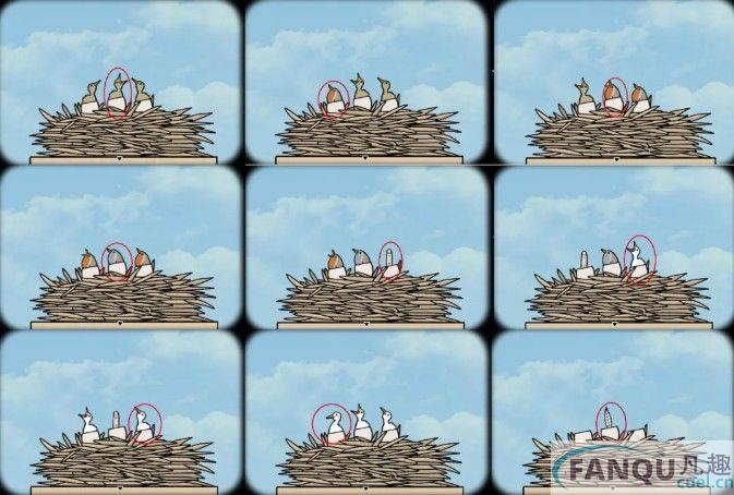 先点击三只鸟里和其他两只不同的那一只。之后的步骤中,点击三只鸟里 相比之前发生变化的那一只,不断重复这个过程。