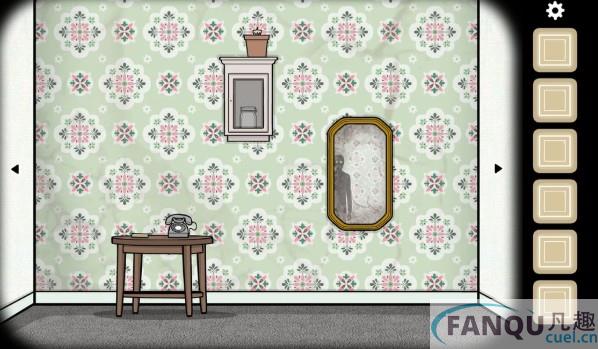 进入房间,映入眼帘的是桌子上的电话以及信封。柜子里锁着一个玻璃罐子,上方还有一个花盆。镜子里倒映着一个诡异的黑影。