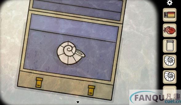 来到柜子这边,在蓝色内衬的盒子里找到第三枚螺壳。