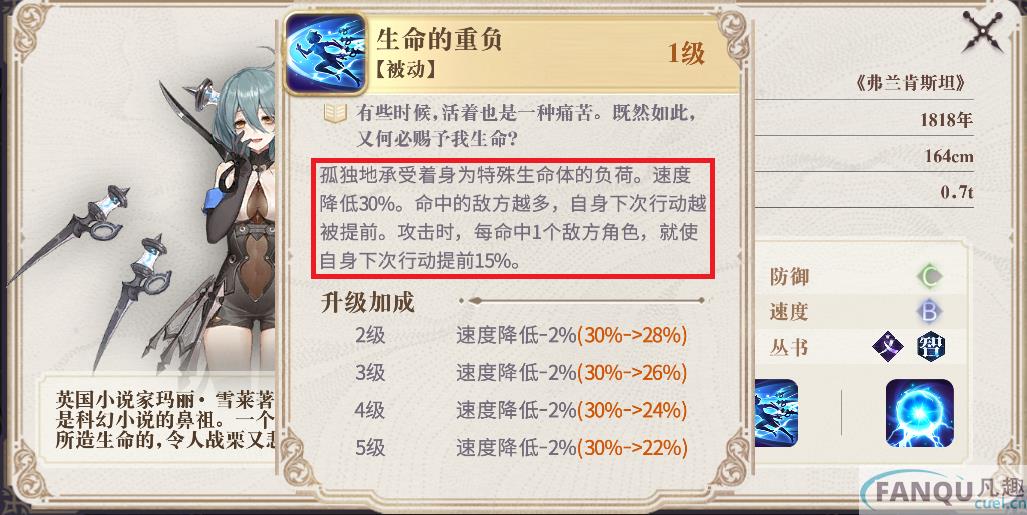 弗兰肯斯坦攻击时会将伤害传递给最近的敌人,因此输出不需要考虑敌人站位,加上被动命中敌人后会使自己下一次出手提前,在推图时可以打出更多群伤。如果你抽到了她,那么无论是推图还是刷材料,都会非常轻松。