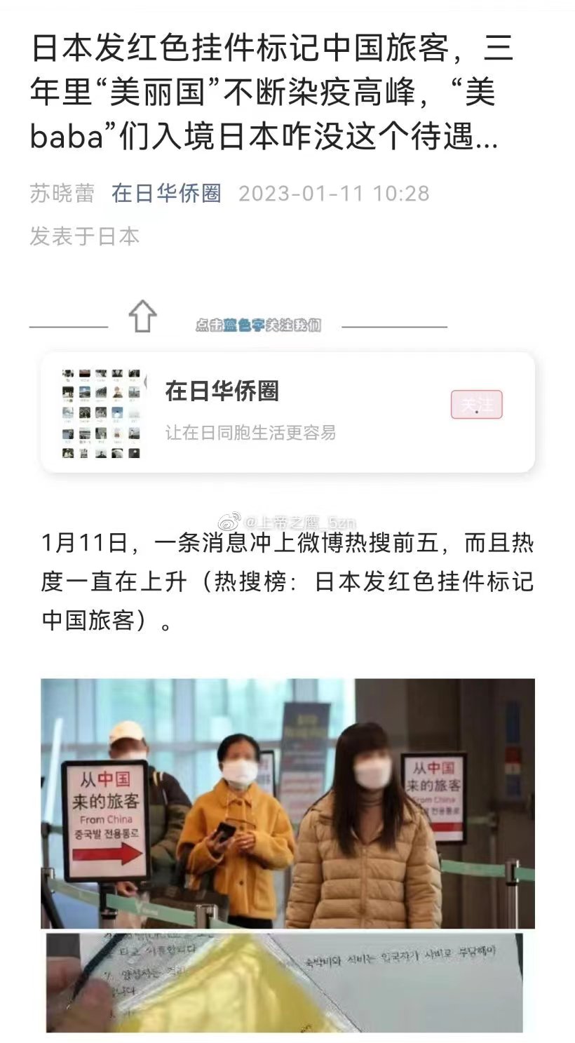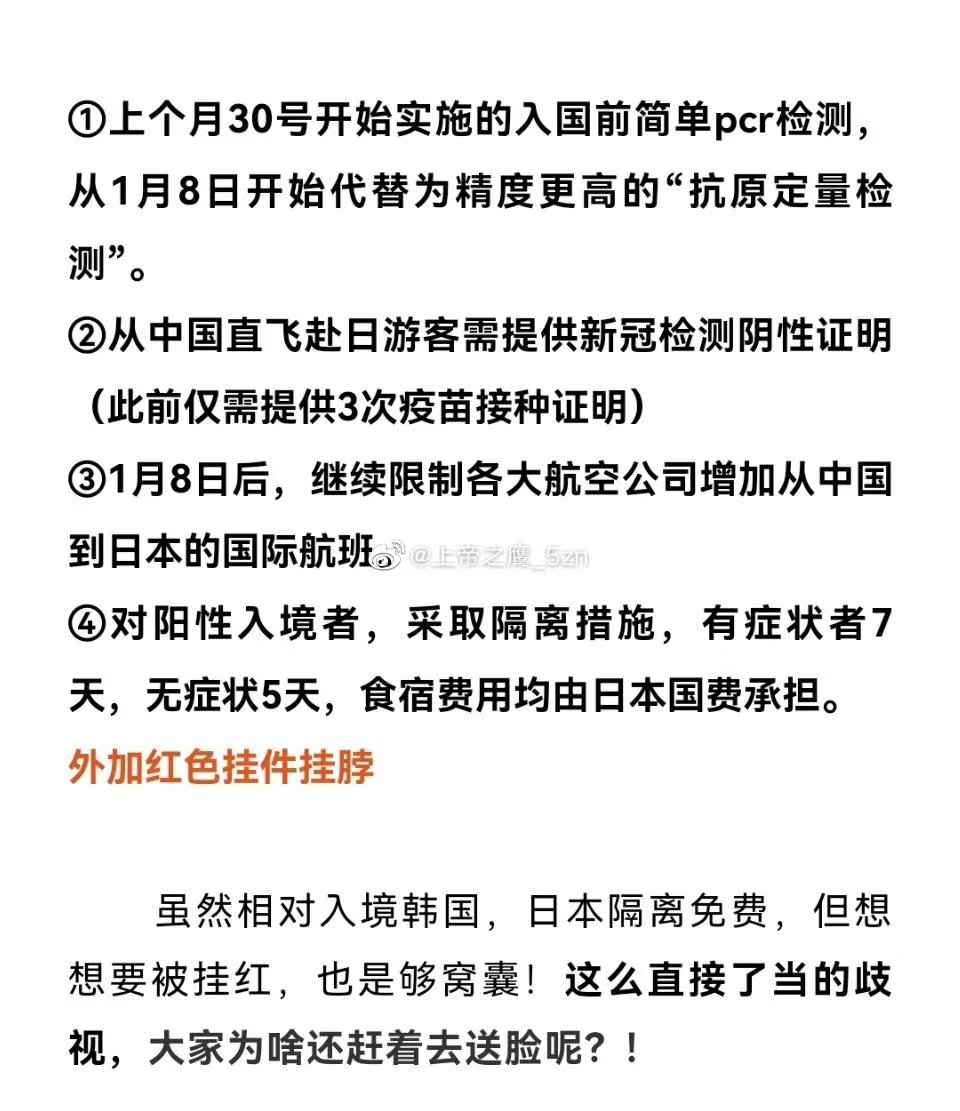 此前,韩国也有类似歧视性政策,中国游客下飞机后遭到一系列离谱对待,只给中国旅客“挂黄牌”。有网友爆料称,下飞机后就收到一个黄色牌子,被要求挂在脖子上,然后被带去单独的区域,自费8万韩元做核酸,而且这种“待遇”只是针对中国人。