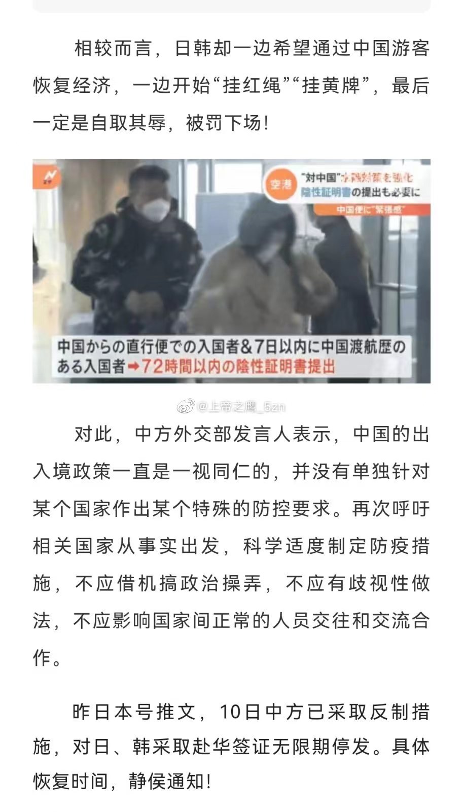 遥想当时我国为了民众的身体健康,严格管控了疫情3年,而美国带头指责中国这是在“侵犯人权”,如今我国在最佳的时机放开管制以便恢复正常的生产生活,美国又带头继续抹黑中国,这些政客不会去听卫生官员和专家的科学依据,他们只坚信自己编造的谎言就是事实。对于韩国日本这种多次不听劝和警告的国家,我国终于进行了同等反制,既然日韩对入境的中国旅客进行不公平的待遇,那我国就暂停日韩的普通签证签发工作。