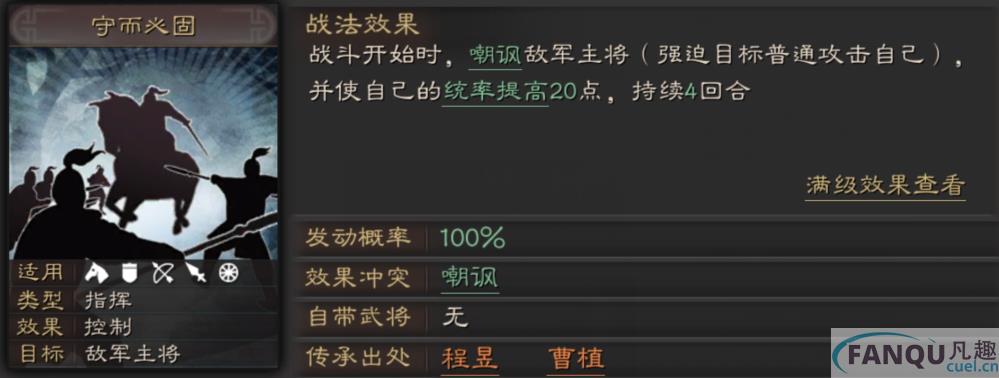 可拆战法【指挥战法】守而必固:嘲讽敌军主将,并提升自身统率属性持续4回合。