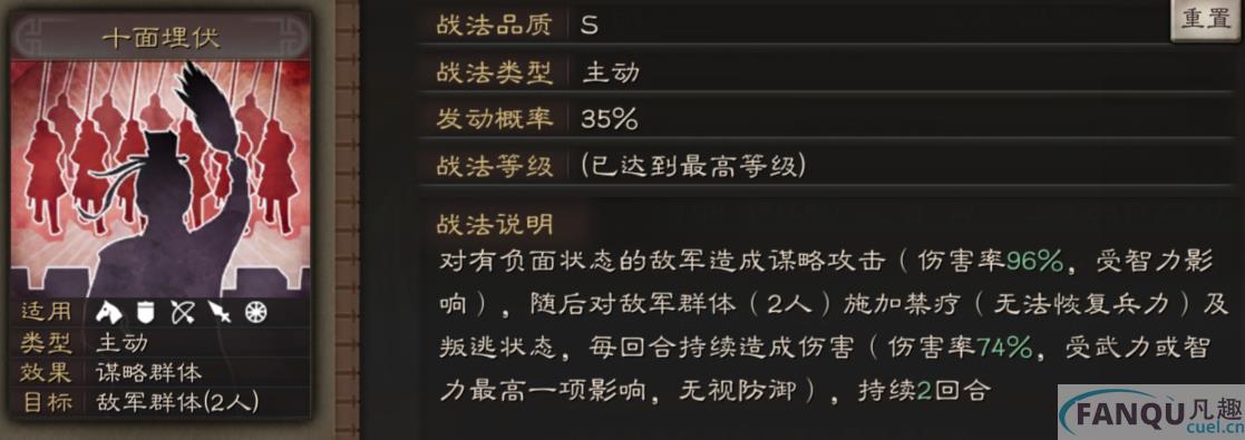 【主动战法】十面埋伏:对有负面状态的敌军造成谋略伤害,随后对敌军2人施加禁疗和叛逃状态持续2回合。