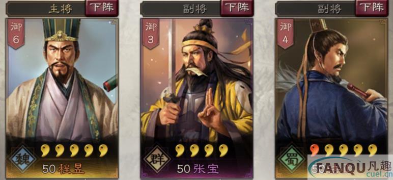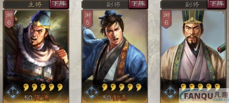 组合3人同属魏阵营,可以获得额外的属性加成。组合推荐使用骑兵或者弓兵出战,战斗中庞德和程昱拥有驱除增益,施加大量减益的特性,通过调节状态来取得攻防上的优势。作为主将的庞德也能郭嘉的保护免于被爆发带走。