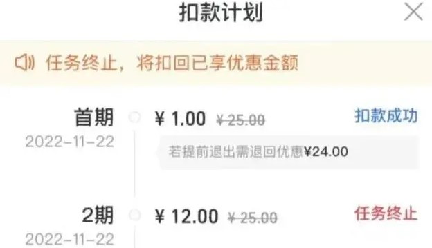 由于并无长期会员需求,不少用户选择了提前中止参与该活动,不料却立刻收到了扣费 24 元的提示:“未完成任务,扣回已享优惠。”