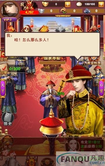 梦回大清,体验治理天下,活色生香,体验佳丽三千,杀伐决断,体验上阵父子兵。开服七日,每天都可以领取一份奖励,充值1元可以获得超值奖励,有三挡可供选择,千万不容错过!专属的NPC剧情,你需要从默默无闻的小官发展,最终成为权倾朝野的人物,联姻结盟拉拢势力,成为清朝的皇帝,谱写属于你的传奇。