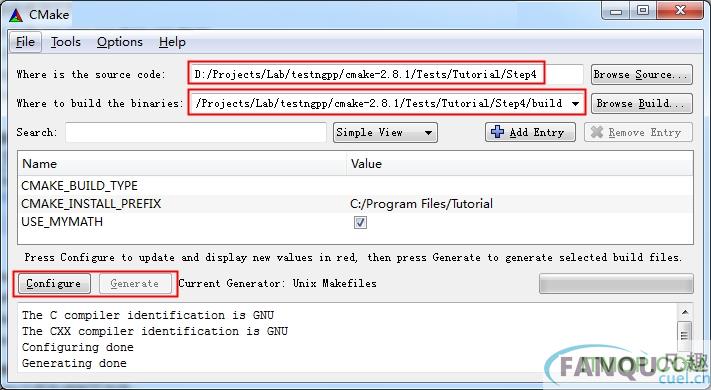 CMake的所有的语句都写在一个叫:CMakeLists.txt 的文件中。当CMakeLists.txt文件确定后,可以用ccmake命令对相关 的变量值进行配置。这个命令必须指向CMakeLists.txt所在的目录。配置完成之后,应用cmake命令生成相应的makefile(在Unix like系统下)或者 project文件(指定用window下的相应编程工具编译时)。