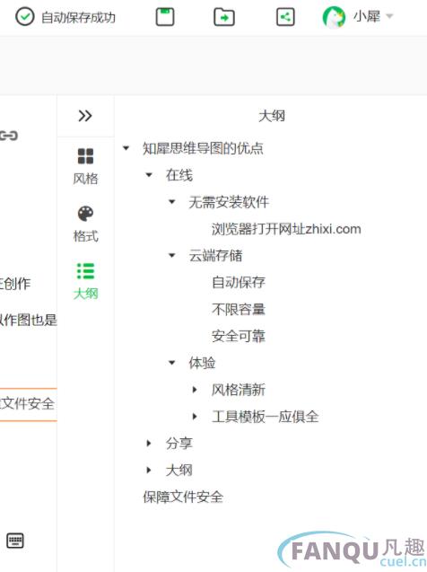 知犀思维导图会自动生成大纲,点击大纲即可预览。大纲内容与思维导图实时同步,并且还可以直接对大纲进行修改。