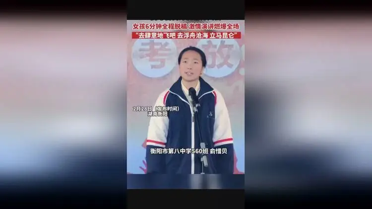 近日,湖南衡阳高考百日誓师大会,女孩6分钟全程脱稿,激情演讲燃爆全场,眼神坚毅,斗志昂扬,如果不出意外,必将金榜题名、鹏程万里!感兴趣的小伙伴可以持续关注本站,及时了解后续相关资讯,接下来让我们一起来看看吧!...