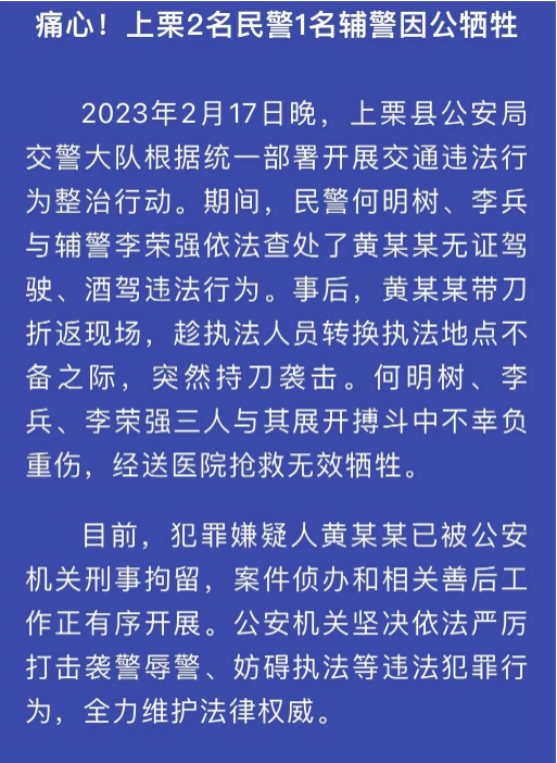2月17日晚,上栗县交警大队在县城查酒驾时一名嫌疑人因无证驾驶、酒驾被查,嫌疑人持刀将2名民警1名辅警刺伤,3人经抢救无效牺牲。...